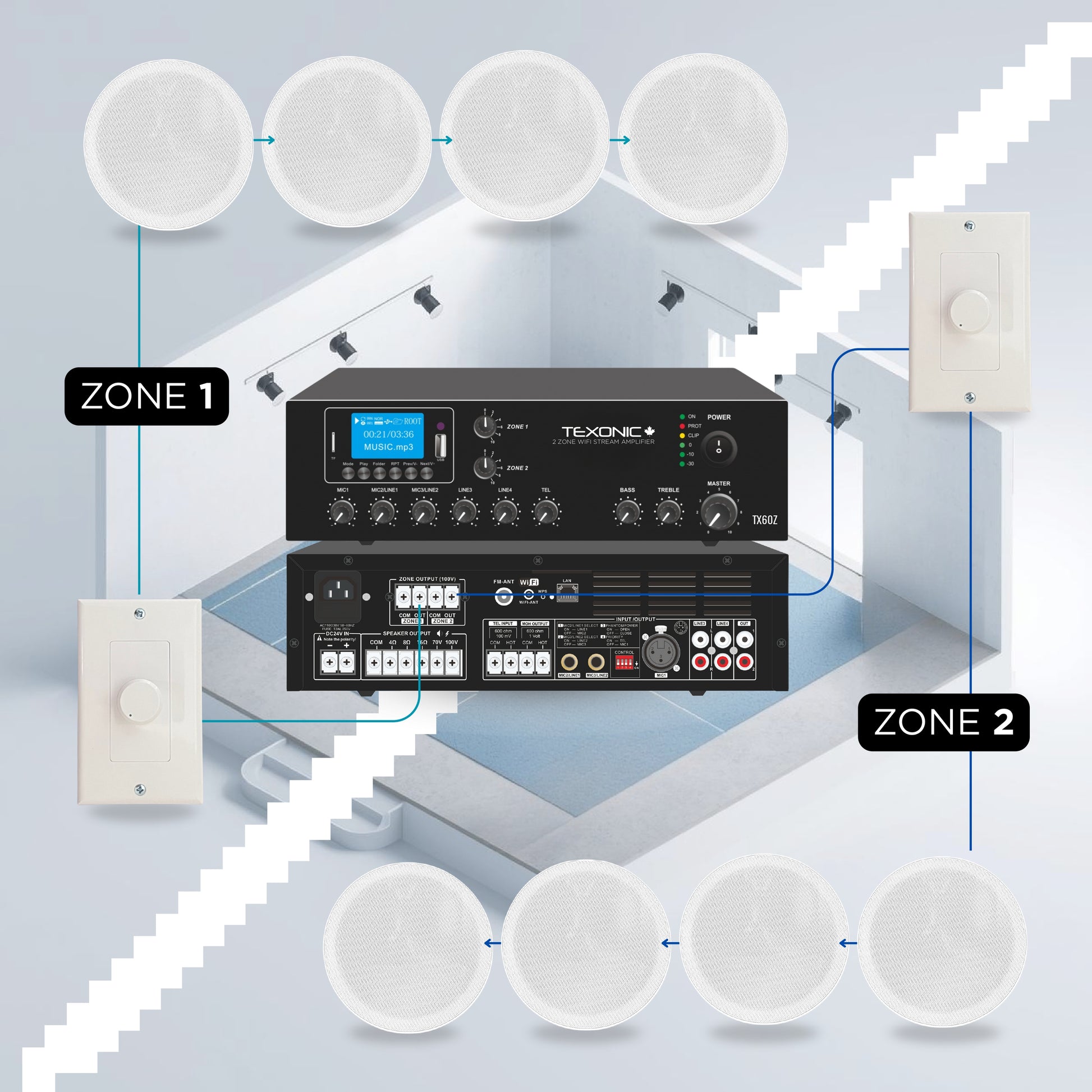 TEXONIC TX Z Series 60W 2-Zone Mixer Amplifier: Wi-Fi, Bluetooth & FM – Commercial Audio Solution